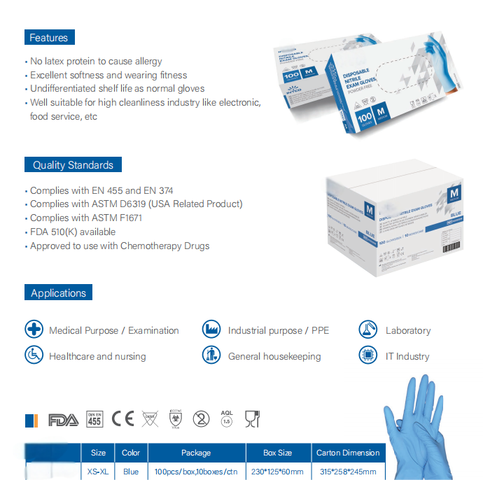Latex-free blue nitrile examination gloves offering reliable protection, comfort, and flexibility for medical, laboratory, industrial, food handling, and cleaning use. Compliant with EN 455, EN 374, ASTM D6319, and ASTM F1671 standards. Available in sizes S–XL. Sold per carton, with 10 boxes per carton and 100 gloves per box.